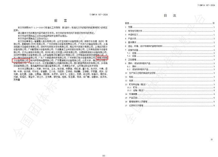 近日,由中國食品工業(yè)協(xié)會發(fā)布了《食品用冰生產(chǎn)和經(jīng)營衛(wèi)生規(guī)范》(T/CNFIA 187-2024,冰勛制冷作為制冷設(shè)備源頭工廠,在行業(yè)標準化建設(shè)中邁出了重要一步,榮幸地成為了標準制定的起草單位之一!參與該項行業(yè)標準的起草編制。
